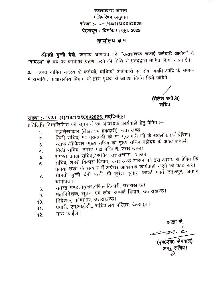 जानकारी के अनुसार बुधवार को सचिव शैलेश बगौली, एवं अपर सचिव एम एस सेमवाल के द्वारा हस्ताक्षर युक्त जारी पत्र मे आमबाग कार्की फॉर्म निवासी श्रीमती मुन्नी देवी पत्नी सुरेश कुमार को उत्तराखंड सफाई कर्मचारी आयोग का सदस्य मनोनीत किया गया है। इन्हें सफाई कर्मचारी आयोग की सदस्य मनोनीत किए जाने पर क्षेत्र में खुशी की लहर है। आपको बता दें सफाई कर्मचारी आयोग की सदस्य मुन्नी देवी के पति सुरेश कुमार जो कि एनएचपीसी बनबसा में विगत वर्ष 31 अगस्त 2024 को डिप्टी मैनेजर एचआर विभाग से सेवानिवृत हुए हैं। श्रीमती मुन्नी देवी को सफाई कर्मचारी आयोग का सदस्य मनोनीत किए जाने पर पालिका अध्यक्ष विपिन कुमार वर्मा, पूर्व पालिका अध्यक्ष हर्षवर्धन सिंह रावत, व्यापार मंडल अध्यक्ष वैभव अग्रवाल, सभासद शैलेंद्र सिंह, भाजपा मंडल अध्यक्ष तुलसी कवंर, भाजपा मंडल उपाध्यक्ष रीता कलखुडिया, सहित गणमान्य लोगों ने शुभकामनाएं दी है।