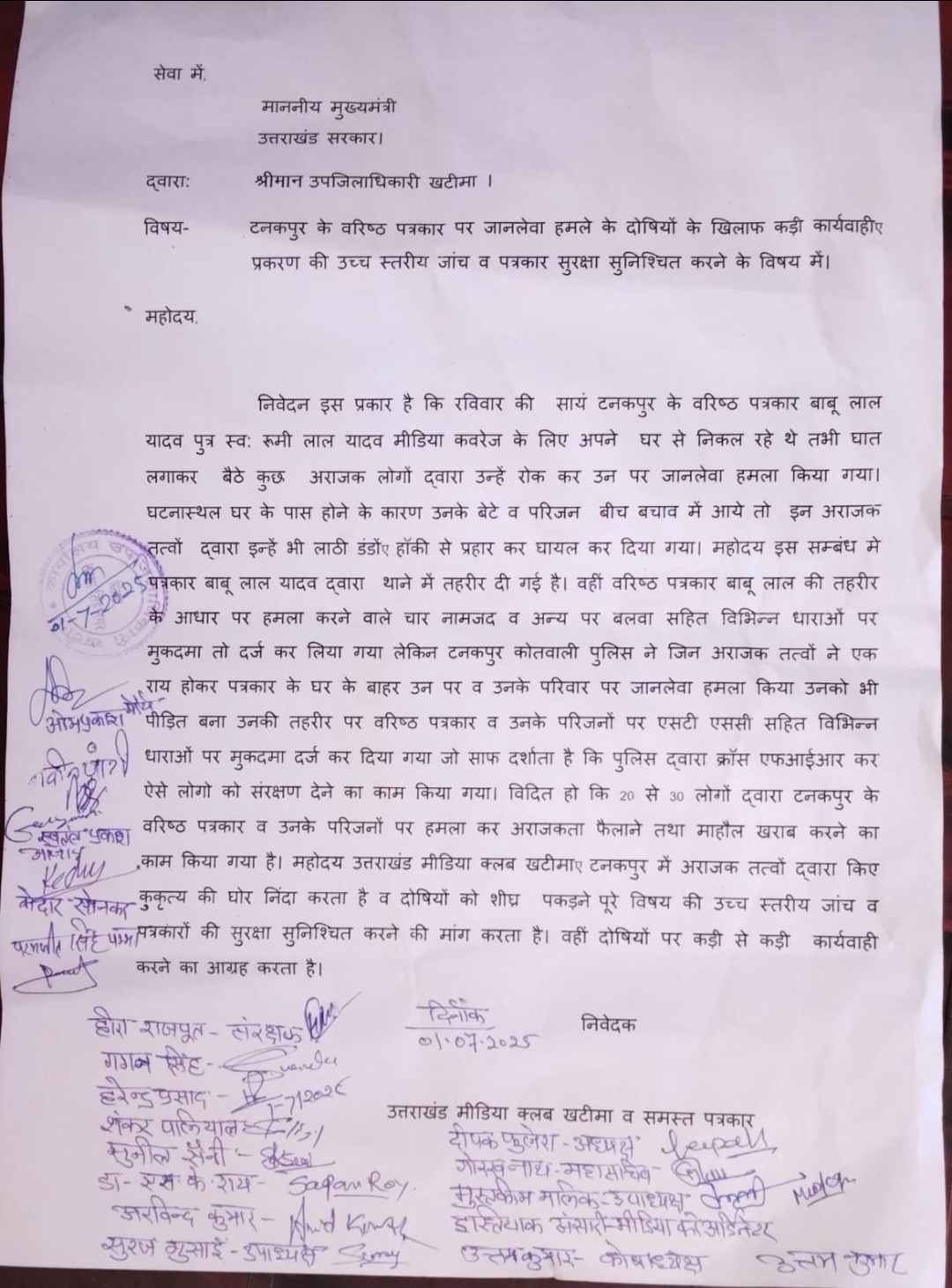 वरिष्ठ पत्रकार बाबूलाल यादव व उनके परिजनों पर अराजक तत्व द्वारा किए : गए हमले के मामले मे खटीमा के पत्रकारों ने आक्रोश जताते हुए कार्रवाई की करी मांग, सीएम को भेजा ज्ञापन
