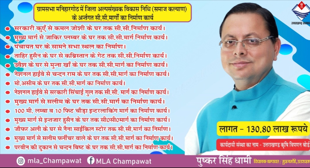 कहा कि उत्तराखंड के युवा अब स्टार्ट अप नवाचार और तकनीकी शिक्षा के अवसर का लाभ उठा रहे हैं जिससे अगली पीढ़ी में आत्मनिर्भरता की भावना का विकास हो रहा है। साथ ही तेजी से हो रहे बुनियादी ढांचे के विकास खासकर सड़कों और पुलों के निर्माण में दुर्दशा के क्षेत्र को मुख्य धारा की प्रगति से जोड़ा है। और राज्य की आर्थिक गति को गति दी है। उन्होंने बताया कि ग्राम सभा मनिहारगोठ में जिला अल्पसंख्यक विकास निधि (समाज कल्याण) के अंतर्गत सीसी मार्गों का निर्माण कार्य उत्तराखंड कृषि विपणन बोर्ड के माध्यम से शुरू करा दिया गया है। जिसके तहत ग्राम पंचायत मनिहार गोठ में 14 सीसी संपर्क मार्ग निर्माण के लिए एक करोड़ 30 लाख 80 हजार रुपए स्वीकृत किए गए हैं। इधर भाजपा अल्पसंख्यक प्रकोष्ठ के जिला अध्यक्ष अमजद भाई, ग्राम प्रधान शहाना खातून, मस्जिद कमेटी के सदर कदीर हुसैन, पूर्व सदर शाफिकुर रहमान सहित तमाम गणमान्य लोगों ने अल्पसंख्यक विकास निधि से कराए जा रहे विकास कार्यों के लिए धामी सरकार का आभार व्यक्त किया।